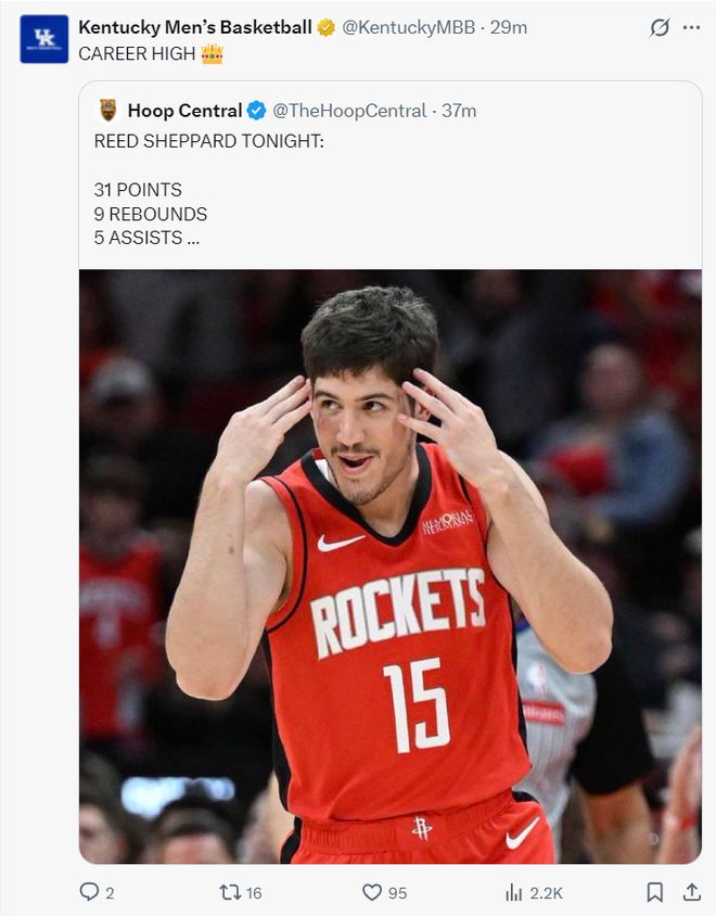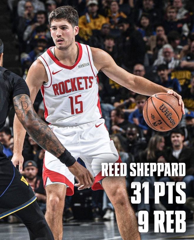 里德-謝潑德又迎來了生涯之夜,5天之前他剛剛在主場拿到27分生涯新高,5天后他在客場拿到31分9籃板再度創(chuàng)造生涯新高,得分、籃板都是生涯新高的,最關(guān)鍵的是他幫助火箭取勝,沒有杜蘭特+申京狀態(tài)糟糕,二年級的小謝扶大廈之將傾,挽狂瀾于既倒。