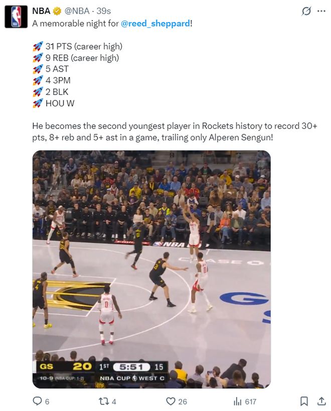 根據(jù)NBA官方的數(shù)據(jù),謝潑德成為火箭隊(duì)史第二年輕能單場拿到30+8籃板+5助攻的球員,最年輕的是申京。